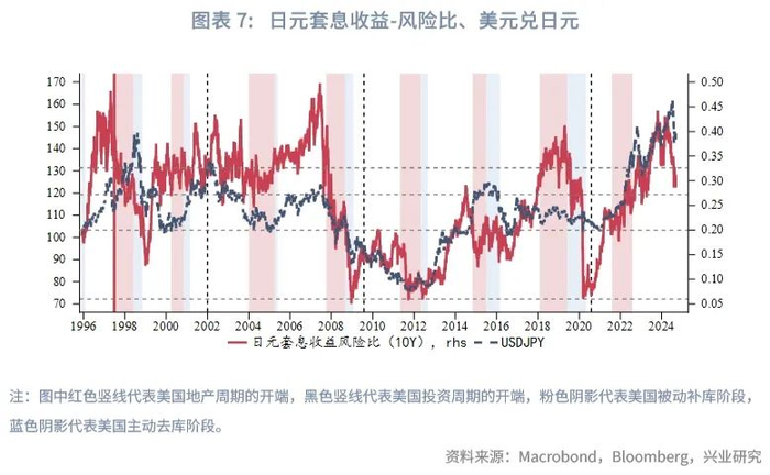 趋势上看,2024年7月后日元套息交易经历了一波平仓,后续在套息收益-风险比跌破前期密集成交位0.326时反弹(详见《日元套息交易反转的四个阶段20240812》)。然而完整的套息交易出清还远未结束,日元踏上升值的大周期,升值大周期中日元波段路径如何演绎,将视美国是否还有第三库存周期而异。