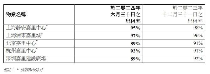 出租率方面,截至2024年6月30日,北京环球金融中心出租率约80%;上海六八八广场以及上海环智国际大厦出租率均达94%;上海恒基名人商业大厦出租率为93%;上海港汇中心二座以及位于淮海中路商贸地段之合作项目,出租率均逾80%;不过,上海恒汇国际大厦由于周边商厦竞争加剧,出租率约为七成;