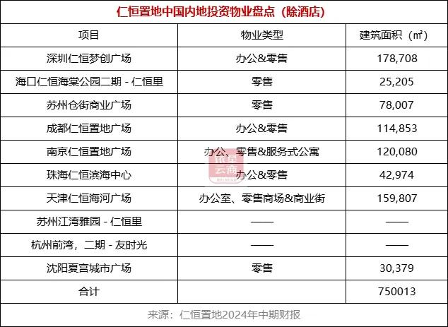 仁恒置地的投资房地产物业主要分布在中国内地及新加坡。财报显示,仁恒置地在中国内地拥有深圳仁恒梦创广场、海口仁恒里、苏州仓街商业广场、成都仁恒置地广场等约10座投资物业(除酒店、如上表所示),总建筑面积超75万平米。