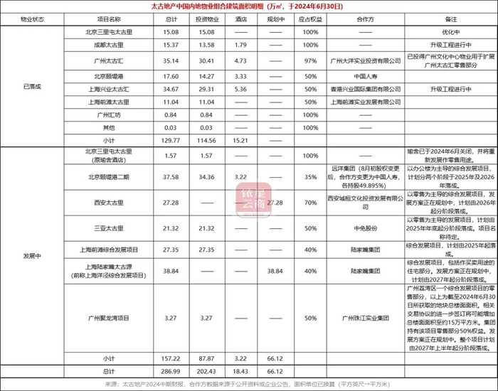 太古地产在财报中详细列出了在中国内地的的各投资物业的建筑面积、状态及权益比例,我们在此补充合作方信息,如下表所示。