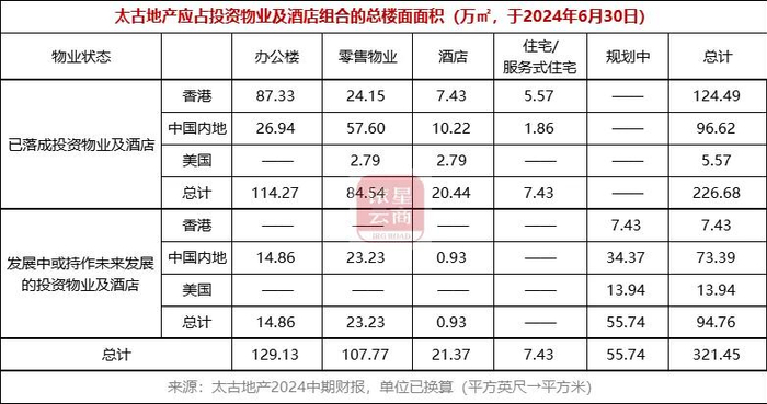 截至2024年6月30日,太古地产应占物业组合的总楼面面积约365万平方米。其中,约有321.45万平方米为投资物业及酒店,包括已落成投资物业及酒店约226.68万平方米,及发展中或持作未来发展的投资物业约94.76万平方米。