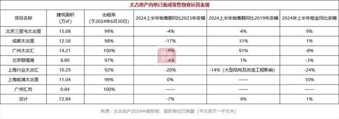 在营零售物业方面,该公司运营的北京三里屯太古里、成都太古里、广州滙坊、广州太古滙、北京颐堤港、上海的兴业太古汇和前滩太古里等,由于出境旅游上升,旗下部分商场进行改建及翻新工程的影响,加上2023年的高基数效应, 2024年上半年太古地产中国内地的应占零售销售额下跌7%(不包括汽车零售商销售额),但人流稳定,出租率亦保持在高水平。尤其对比疫情前的2019年同期销售额增幅高达69%,撇除上海兴业太古汇的工程改造和疫情前的2019年上海前滩太古里未开业影响,中国内地2024上半年的整体零售销售额上升了4%。