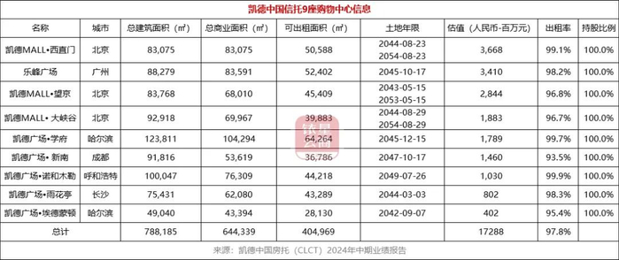资料显示,凯德置地中国信托(CLCT)投资组合包括9个购物中心、5个商业园区物业和4个物流园区物业。投资组合总建筑面积约为180万平方米,分布于中国12个主要城市。其中,9座购物中心包括北京3座:凯德MALL西直门、凯德MALL望京、凯德MALL大峡谷;北京以外6座:广州乐峰广场、成都凯德广场新南、呼和浩特诺和木勒、哈尔滨的凯德学府和凯德广场埃德蒙顿、长沙凯德广场雨花亭,按2023年末人民币估值约173亿元。