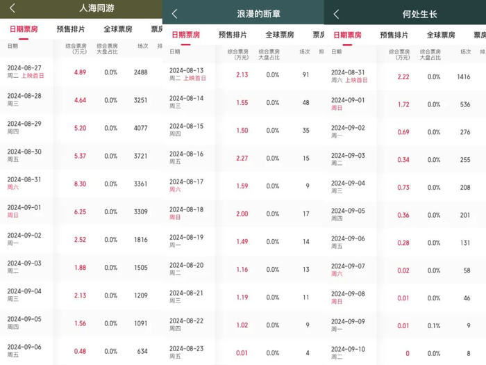 据猫眼专业版信息,《人海同游》上映首周全国平均排映总场次能达到3000场以上,最多的一天有4000余场。