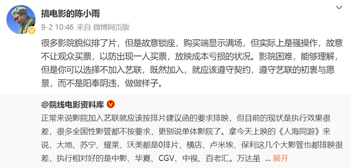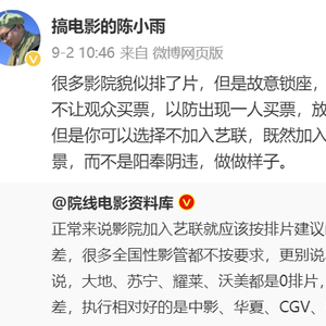 而这次陈小雨反映的问题显然更加隐蔽:部分影城有排片,第三方平台也会有排映场次记录,但实际上在用各种手段阻止观众入场。