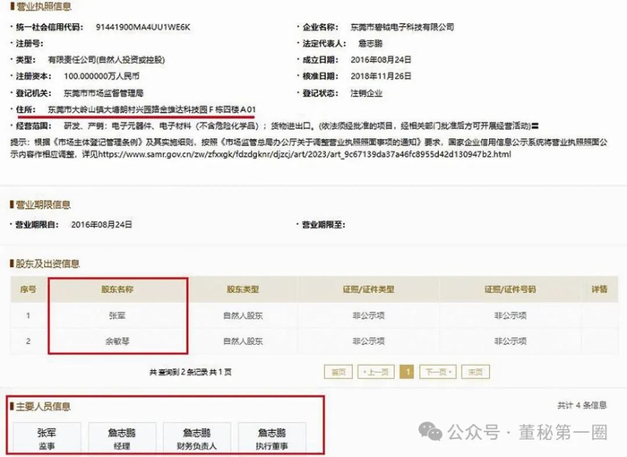 通过国家企信平台和企查查查询的工商信息显示,东莞碧钺2016年8月24日成立、2018年11月26日注销,存续期间股东为张军(持股95%)、余敏琴(持股5%),詹志鹏担任法定代表人、执行董事、经理、财务负责人,张军任监事(见图二),存续期间未发生股东、主要人员等变更。