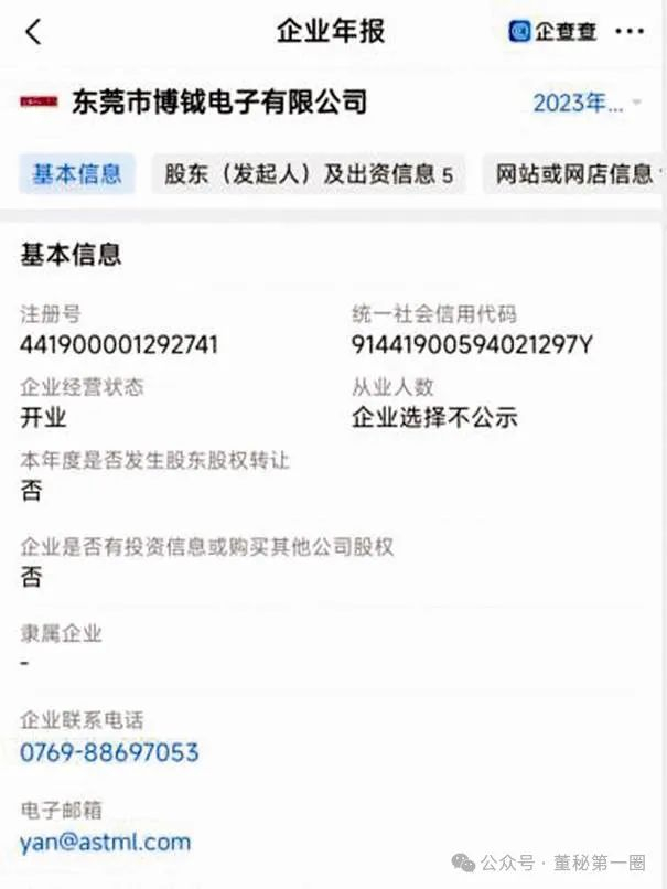 东莞碧钺向当地市场监督机构提交的2017年企业年报显示,企业联系邮箱为yan@astml.com(见图三),而东莞博钺提交的2023年企业年报显示,企业联系邮箱也是yan@astml.com(见图四),还有2013年企业年报的企业联系邮箱为sindyzhan@astml.com。