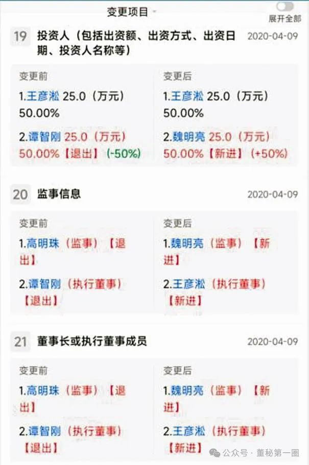 但通过国家企信平台和企查查查询到的工商信息显示,深圳市森创灿升电子有限公司2020年4月9日发生变更登记,谭智刚不再担任执行董事并由持股50%变为退出(见图五),登记信息显示其2009年5月21日登记成为执行董事。