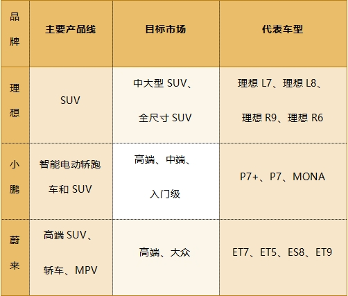 理想汽车的产品线以SUV为主,聚焦中大型和全尺寸SUV市场,其市场份额领先,产品线丰富。小鹏汽车则兼顾轿车和SUV,其P7系列在智能驾驶和智能座舱方面具有领先优势。蔚来汽车拥有更为丰富的产品线,涵盖高端SUV、轿车、MPV等细分市场,ET7、ET5、ES8等车型在各自细分市场占据领先地位。三家车企都在积极拓展产品线,以满足不同细分市场的需求,并进一步提升市场竞争力。