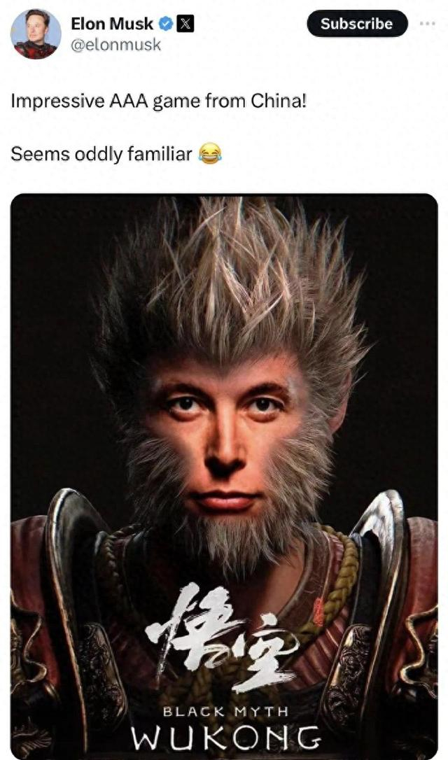 他还贴出了一张AI生成的图片,让孙悟空看起来更像马斯克。他调侃说,这样看起来就熟悉多了。