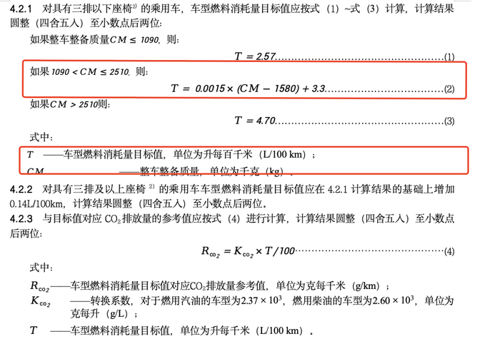 1.整备质量小于1090kg的车型,百公里油耗需控制在2.57L内;2.整备质量在1090-2510kg之间的车型,百公里油耗需控制在3.3L内;3.整备质量大于2510kg的,百公里油耗需控制在4.7L内。