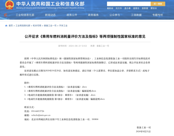 2024年8月21日,工信部发布了公开征求《乘用车燃料消耗量评价方法及指标》等两项强制性国家标准的意见。