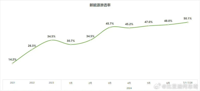 今年7月,国内新能源汽车渗透率首次有完整月份突破50%,创造历史。
