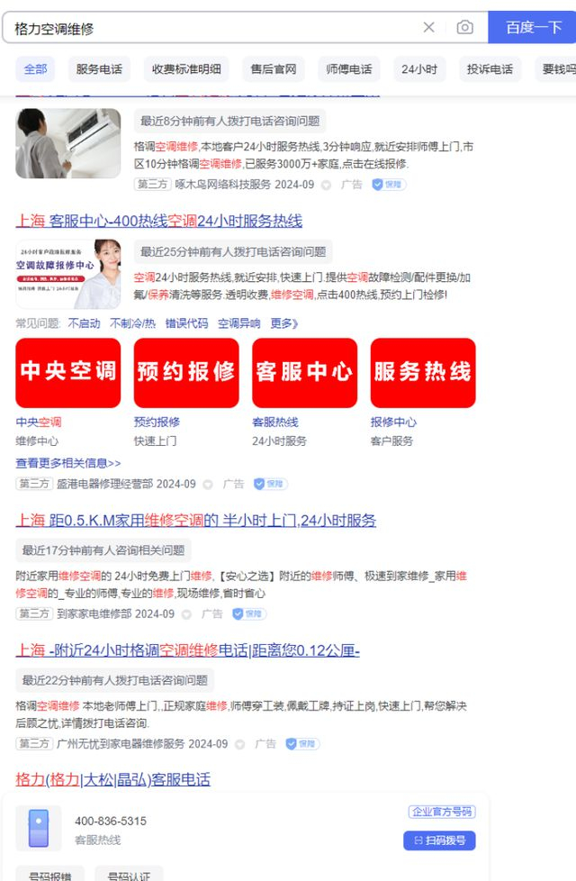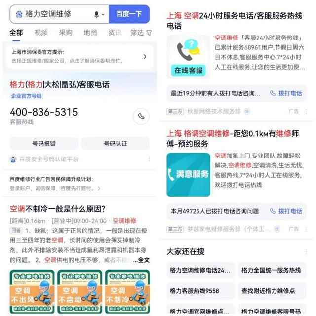 记者近日搜索发现,情况有所好转。当再次搜索“格力空调维修”,发现正确的企业官方号码被显示在第一条。不过,第二条看似实用科普的文章,点进之后才发现,仍是第三方“**鸟家庭维修”的广告。