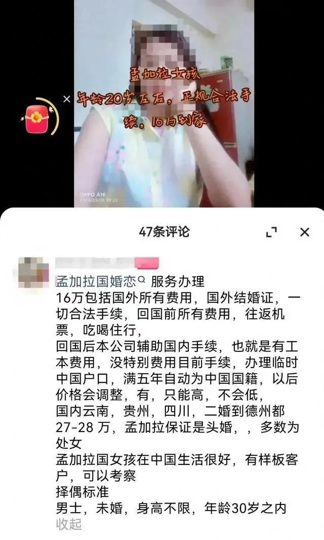 孟加拉国的“新娘”是16万、越南的“新娘”也是16万。好像这16万的费用,成了统一“市场价”。几乎所有的东南亚“跨国婚介”对国内意欲找个外国媳妇的报价,都在这个价位。这就很难用巧合来解释了,说到底,是为了“爱情”还是为了生意,大家自有判断。