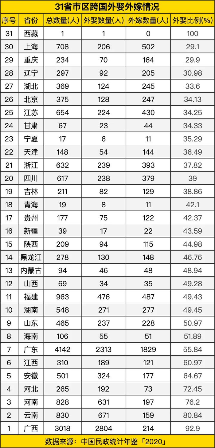 以前都是咱们国内的姑娘嫁到国外的多,但这些年,特别是2018年之后,已经反了过来。国外的女生嫁到中国的数量,已经超过了外嫁的女性。