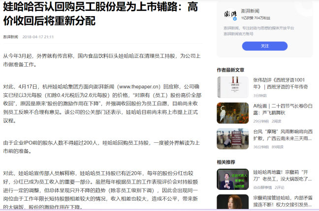 据澎湃新闻2018年4月17日的报道称,当时杭州娃哈哈集团以3元每股(扣除0.4元税后为2.6元每股)的价格,对原有(员工)股份高价全部收回,原因是原来“股份的激励作用在下降”。