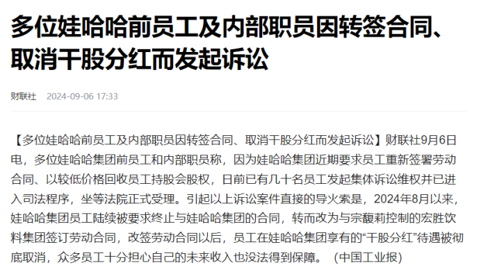 据财联社报道,日前多位娃哈哈集团前员工和内部职员称,因为娃哈哈集团近期要求员工重新签署劳动合同、以较低价格回收员工持股会股权,日前已有几十名员工发起集体诉讼维权并已进入司法程序,坐等法院正式受理。