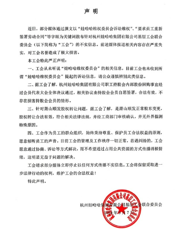 9月7日下午,娃哈哈工会在公司官微发布声明称:工会从未听说“娃哈哈维权委员会”的相关信息,目前工会也未收到所谓“娃哈哈维权委员会”提起的诉讼信息;据工会了解,杭州娃哈哈集团有限公司职工持股会内部股份回购事宜经过会员代表大会全体决议通过,相关协议由持股会会员自愿签署,合法有效,不存在损害持股会会员的情形。
