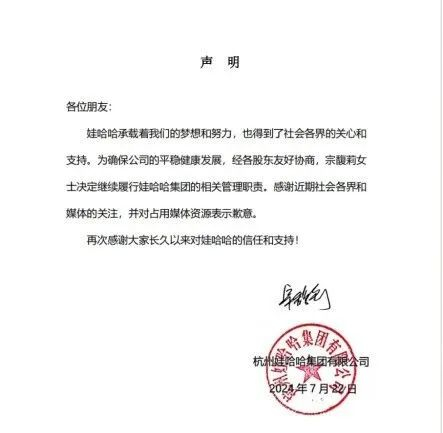 很快在7月22日,娃哈哈集团就公开发表声明,表示经过各股东友好协商,宗馥莉决定继续履行娃哈哈集团的相关管理职责。