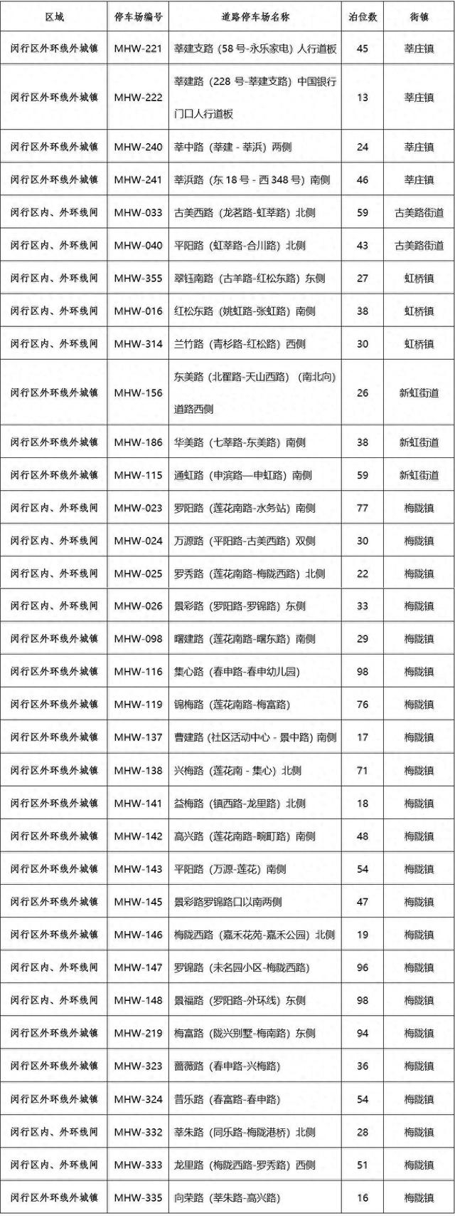 自2024年9月21日零时起,本区在内、外环线间(含外环线外城镇)古美路街道、新虹街道、虹桥镇、莘庄镇、梅陇镇34处道路停车场正式实施智慧收费管理。