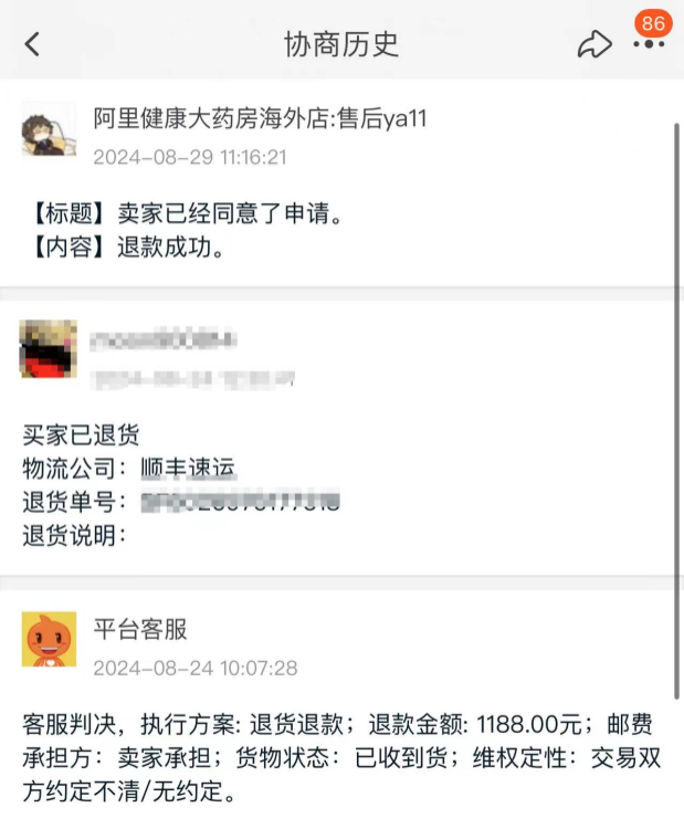 两周后,即8月30日,《消费者报道》记者再次联系吴先生得知,阿里健康大药房已经同意他的退货退款申请,但给出的理由十分含糊,对于他质疑的产品不合规、售假等问题,卖方及平台方只字不提。