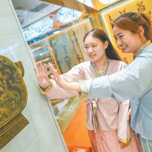 北京稻香村“零号寻宝馆”在隆福寺前街开业。店内设计了寻宝互动装置,消费者正在体验以“盉”为造型的洁手装置。本报记者武亦彬 摄