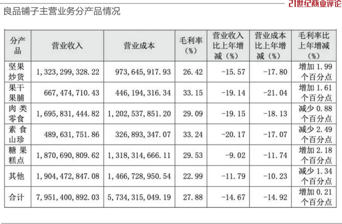 其中,“果干果脯”“肉类零食”“素食山珍”下降比重,都在2成左右,拖累整体营收下降14.76%。