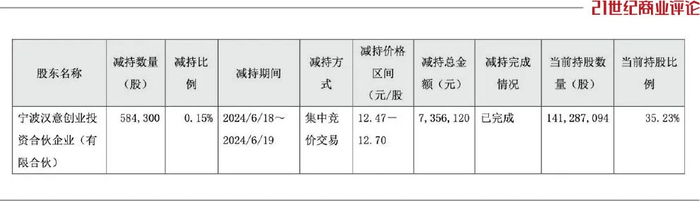 宁波汉意的持股比例,由35.38%微减至35.23%,仍为最大股东。