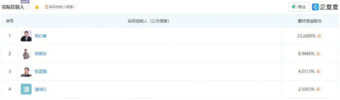 企查查显示,杨红春和杨银芬的最终受益股分,分别为23.26%和8.94%。