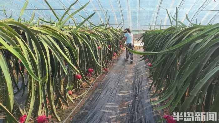 别看如今王金霞对火龙果的种植如数家珍,之前她是地地道道的农民,在家种地,后来又打理了10多年葡萄。她有六七年种火龙果的经验,因为有了打理葡萄的经验,她对火龙果得心应手,非常熟悉它的喜好。“我通过招聘来到这里,农场老板夫妻俩外出学习技术,再回来教我如何种植和打理。刚开始种植火龙果属于探索期,容易遇到不好的苗,长出的火龙果质量不佳。”南果北种想成功,保证高温度是一个重要的条件,南方的火龙果是露天的,在这里火龙果在大棚内。“冬天,大棚内的温度也不能低于5摄氏度,如果太冷还要给大棚支取暖炉。湿度是通过测量的湿度计观测,如果湿度不够就滴灌水。”