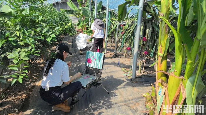 火龙果大棚里温度太高,纵然选择下午仍然闷热,不一会大家的衣服已经湿透。“这对于我们写生来说环境算好的了。”绿泽画院副院长兼指导老师孙艳秋说话总是很温柔,但当天她仍然坚持在火龙果田里创作了一个多小时。