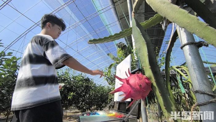 写生告一段落,孙艳秋还带着他们亲手参与了采摘。工作人员仅仅指点一二,他们就开开心心地忙活开了,剪果、拍照,忙得不亦乐乎,也真正成为“丰收体验官”,感受着秋日北方这难得的丰收的喜悦。“还真是第一回自己摘火龙果,快给我拍个照!”