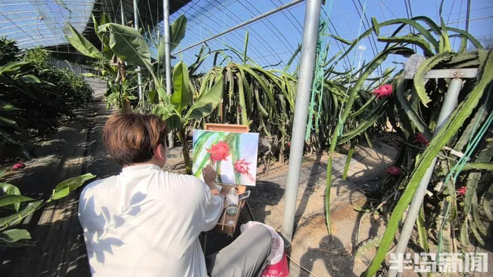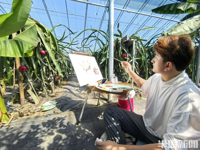 9月6日,在青岛西海岸新区八零小伙家庭农场,火龙果的丰收不仅给了农场主欣喜,更给了来自达尼画家村的艺术家们惊喜。当天他们作为“丰收体验官”来到这里,立即支开画架,开始了以火龙果丰收主题的创作。