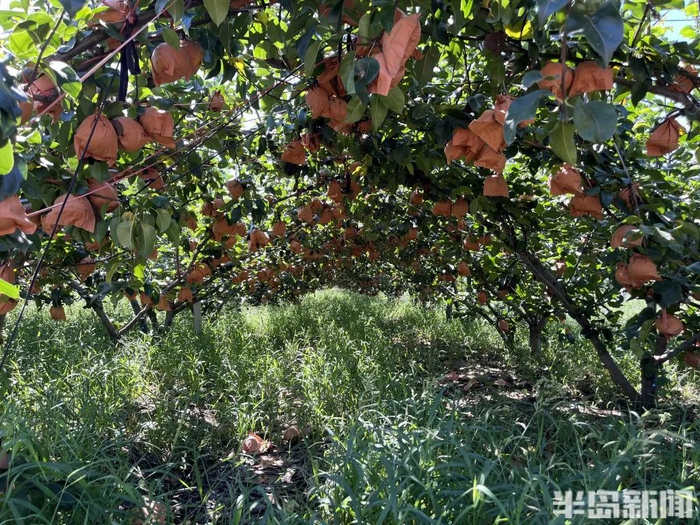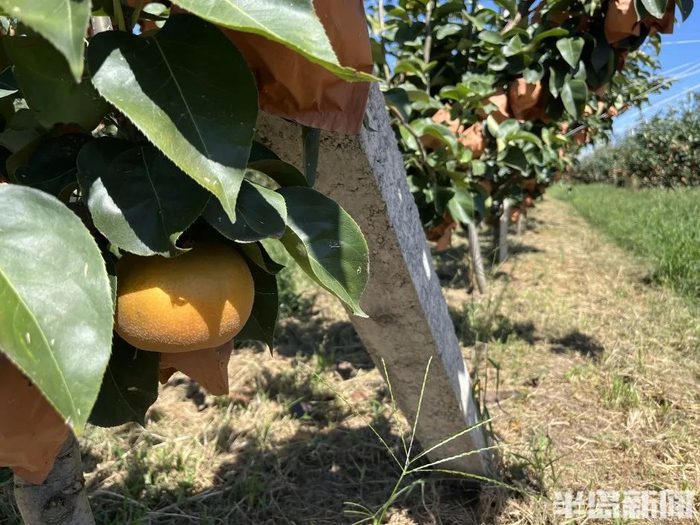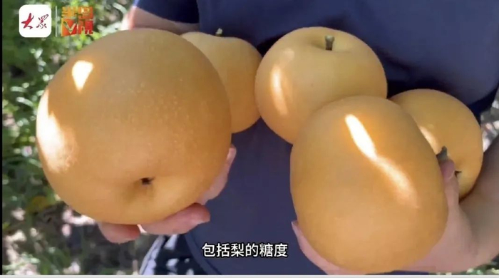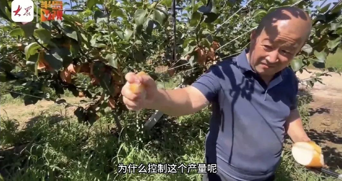 在梨树旁,技术负责人于培永打开了话匣子。“你看我们树底下的草都是正常生长的,我们不会去打除草剂,采摘的前几天,我们会有工人用机器将草打断,这些草就在地下成为了养料,同时我们严格控制每棵树的坐果数量,每棵树坐果不会超过60个,因此我们的亩产量就会低一些,大概每亩地只有6000斤。”于培永说,但是,这样更能保证秋月梨的生长大小和甜度。“今年降水这么多的情况下,我们的甜度都能达到14,并且我们都还是用的高端生物肥,坚决不用膨大剂、增甜素等成分,都是经得起检验的。”