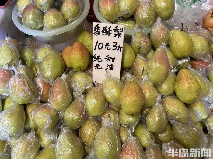 “我们主要就是卖秋月梨和库尔勒香梨,市场供应量很大,秋天嘛,不缺吃的。秋月梨卖得最好,是青岛本地种植的,两种梨子一天能卖个八九百斤。”摊主谢女士介绍,因梨子大量上市,价格也有所下降,秋月梨的人气最高。“最近秋月梨落价了,便宜了八九毛到一块钱左右。根据梨的大小,现在有的秋月梨四块钱一斤,小点的搞特价,五块钱两斤。”