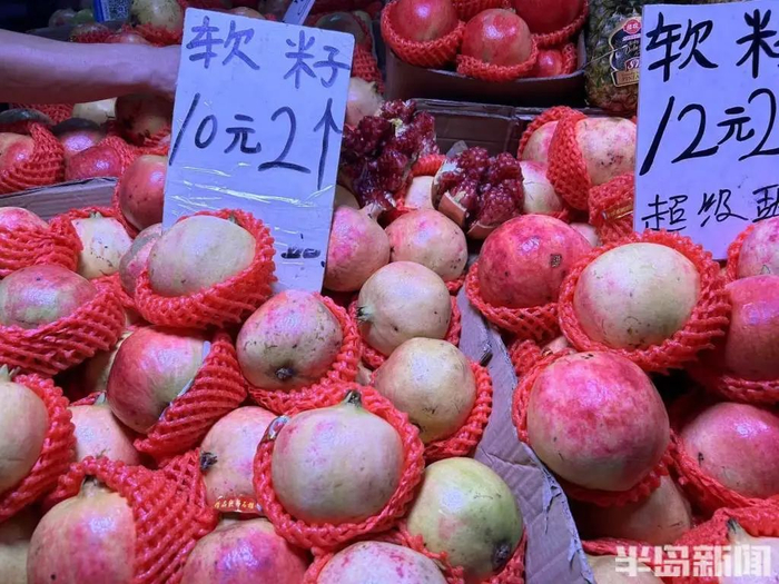 在该农贸市场,多家水果摊位的软籽石榴按“个”卖,体形大的均价在10元至12元两个,外表又大又红的石榴整齐地码放,看起来十分喜人。“石榴卖得挺好,今年丰收了,价格比往年便宜了很多。比如这个十二块钱两个的,往年要卖十块钱一个。”摊主表示,软籽石榴最好在干燥、通风处保存,将其表面水分擦干。“新鲜的石榴闻起来有淡淡的香味,表面光滑颜色鲜艳,像个小灯笼,现在很多人买石榴榨成果汁喝。”