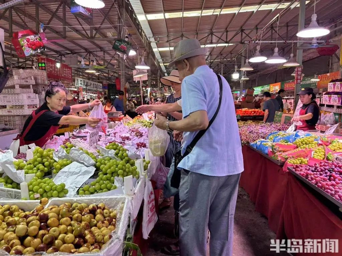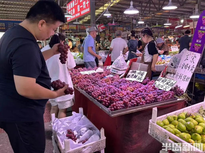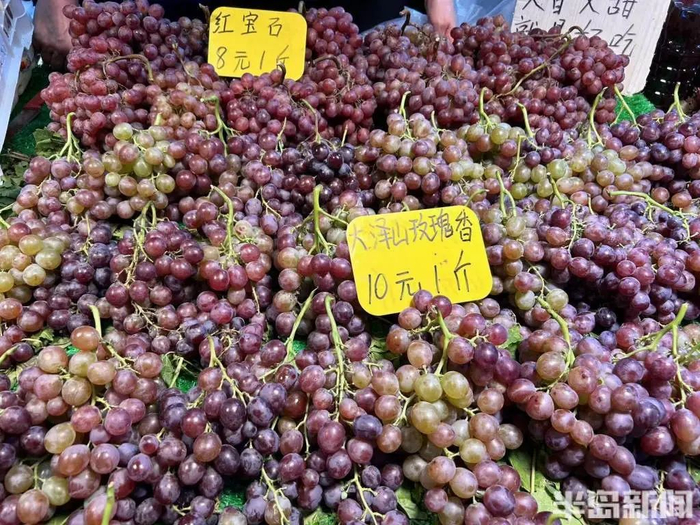“我老家是平度的,主要卖的就是平度大泽山玫瑰香葡萄,也是我这里卖得最好的,现在十块钱一斤。大泽山葡萄是当地的特产,皮薄肉嫩,口感清甜。这个玫瑰香,吃的时候能感觉到一股浓郁的玫瑰香味。”一位主要销售葡萄的摊主介绍。一串串紫色的葡萄,色泽鲜艳,颗颗分明,散发着淡淡的清香。