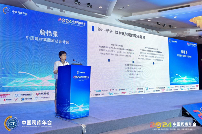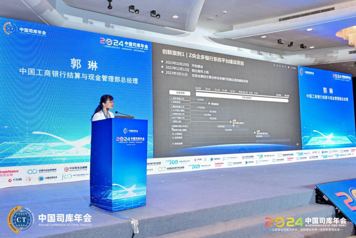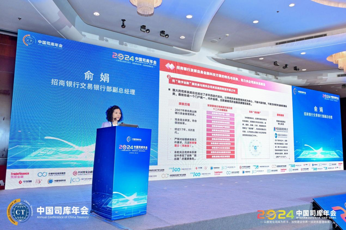 俞娟在大会上发表了题为“积淀十七载,创新‘企业数智金融’服务,助力集团型企业司库体系建设”的精彩演讲。她提到,司库建设不仅是央企的专利,向地方延伸的势头也非常猛烈,17个省市已经发布省属企业司库建设的指导性文件。招商银行深入参与其中,发挥在金融科技方面的职能和价值,助力央国企司库建设。商业银行在帐户、票据、外汇、银企直联方面具有非常强大的专业能力,招商银行首家实现全线上化集团授权的工作,一个平台、一套规则、一次授权就能帮助集团企业实现帐户管控。招商银行为企业提供的不仅仅是金融和系统,而是金融、咨询、科技三者的综合服务,可以为企业提供定制化的咨询方案,通过现状诊断、蓝图设计、业务规划、系统实施,陪伴企业司库体系持续升级。