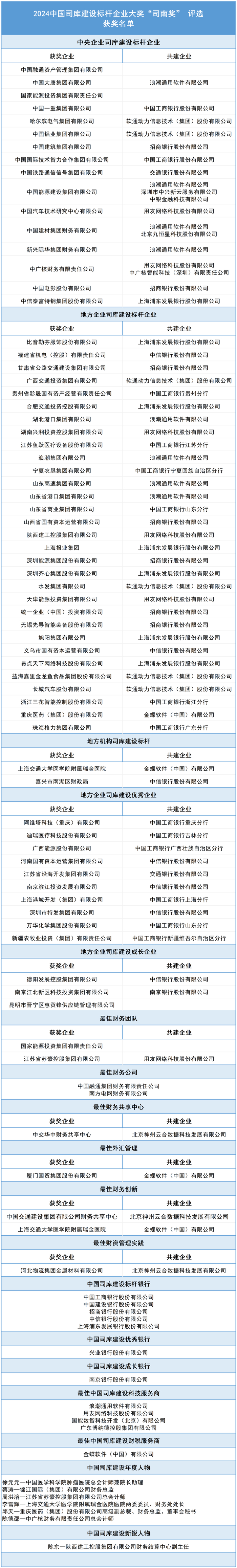 据介绍,中国司库建设标杆企业大奖“司南奖”评选吸引了100多家机构,包括中央企业、地方国有企业、民营大中型企业、银行机构、科技厂商等不同类型机构的参与。在经过评委会多位独立专家对入围名单进行“行业领先、产品创新、用户体验、团队执行、品牌营销”五个维度的综合考评及点评后,最终产生了2024中国司库建设标杆企业大奖“司南奖”的“中央企业司库建设标杆企业”“地方企业司库建设标杆企业”“地方企业司库建设优秀企业”“最佳财务团队”“最佳财务共享中心”“中国司库建设标杆银行”“最佳中国司库建设科技服务商”等18个奖项类别的名单。