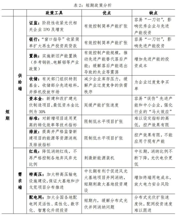 以上一系列政策,分别从供求两侧着手,都能不同程度地缓解当前产能过剩、延缓新增产能的效果。如果侧重“副作用较小”且“立竿见影”,“釜底抽薪”限制光伏企业新增项目融资,特别是简单扩大再生产融资,以及产能置换这二大措施,操作相对简单易行,见效明显。