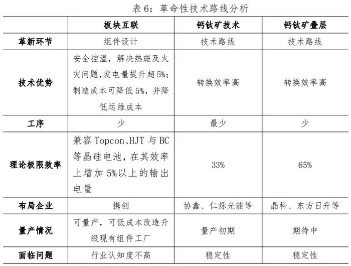 钙钛矿技术。在光伏行业,转换效率决定着技术路线的发展上限。不论是Topcon、HJT或BC,都属于传统晶硅路线,理论极限效率受肖奎极限29.4%的限制,发展空间始终有限。而钙钛矿技术另开门户,极限效率(单结)可达33%,发展空间广阔。同时,其制备原材料纯度要求低且丰富易得,生产流程短、能耗低,有益于降低企业生产成本。但目前钙钛矿技术存在大面积制备难与稳定性差两个问题,制约了其产业化进程。