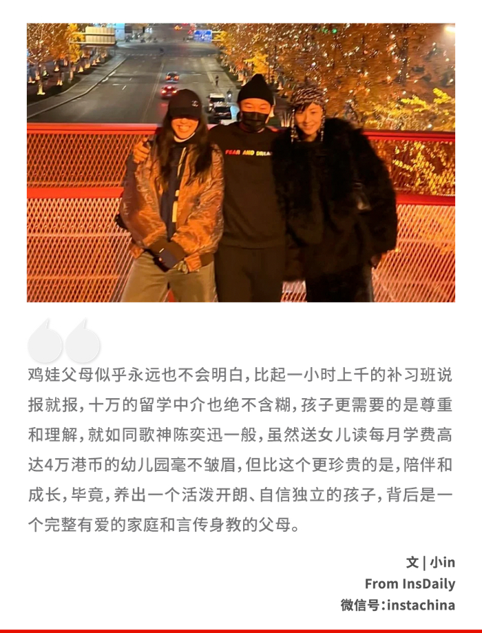 陈奕迅的想法和徐濠萦如出一辙,他很早就对女儿的教育方式表明态度,不会过多干涉她的私生活,给予她足够的空间,尊重她的意愿,她自然会将想说的说出来。