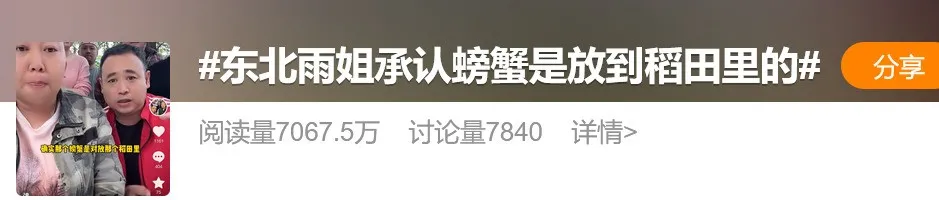 9月7日,千万粉丝网红“东北雨姐”发布的稻田蟹视频引起热议,相关话题冲上微博热搜。
