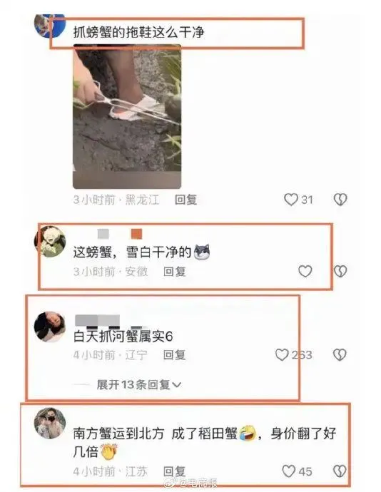 部分网友自称当地养殖稻田蟹村民,在其评论区晒出诸多细节证据,如 “正宗的盘锦稻田蟹没这么大”“抓螃蟹都是晚上在岸边抓”“盘锦稻田蟹很黑”等,证明东北雨姐所抓的稻田蟹是提前安排好的,存在摆拍造假问题。