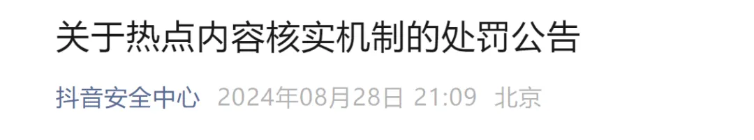 8月28日,抖音安全中心公众号发布《关于热点内容核实机制的处罚公告》: