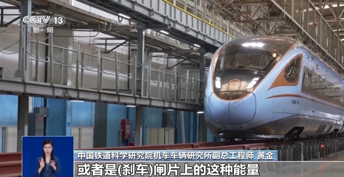 中国铁道科学研究院机车车辆研究所副总工程师 黄金:我们能把制动高铁列车的这种能量,本来应该是消耗到制动盘或者是刹车闸片上的这种能量,通过变流装置,通过原来电能来的这条路径,再返回到取电的接触网上,这样就形成了电能的有效利用。