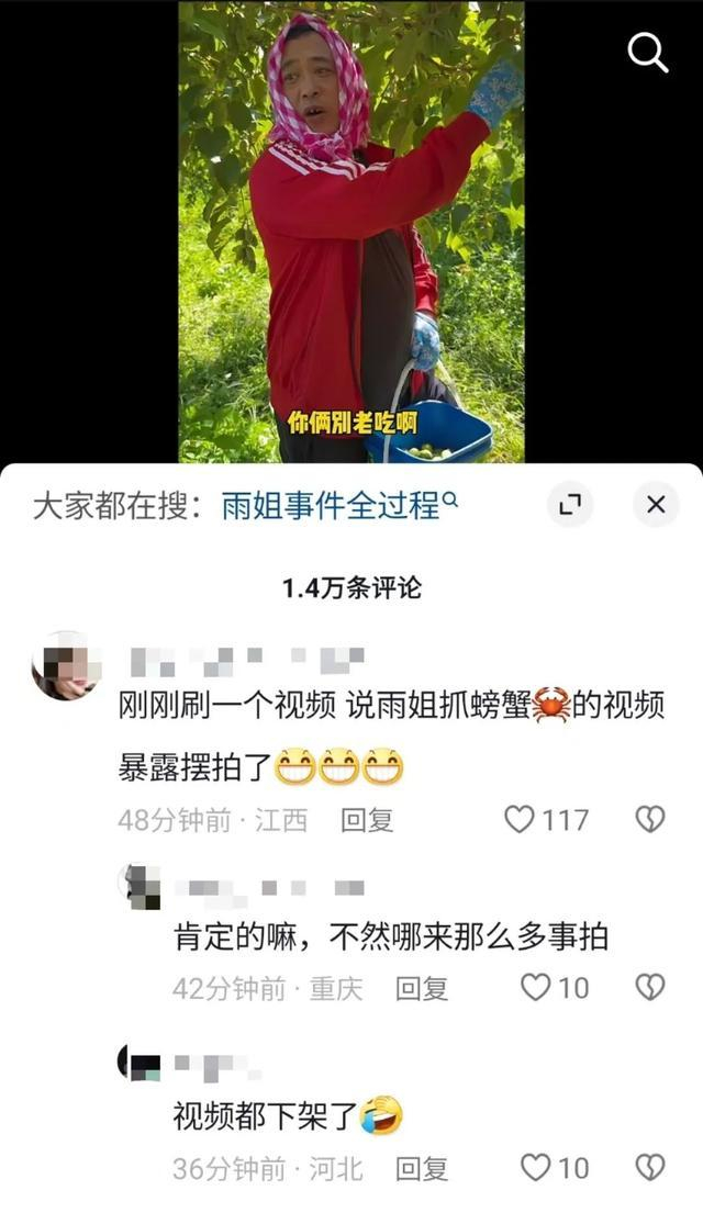 在原视频中,雨姐带着同伴们在稻田抓盘锦螃蟹,气氛热闹非凡,螃蟹品质也比较优质。但在评论区却出现了不少质疑,甚至有人称雨姐“塌房”了。