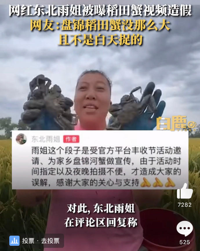 有自称在当地养殖稻田蟹的网友表示,“正宗的盘锦稻田蟹没这么大”“抓螃蟹都是晚上在岸边抓”“盘锦稻田蟹很黑”等,以此证明东北雨姐所抓的稻田蟹是提前安排好的,存在摆拍造假。