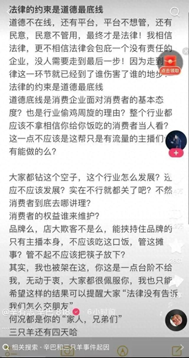 因售卖同品牌大闸蟹,辛巴与三只羊之间的“骂战”仍在不断发酵。9月7日,辛巴再次发文暗指小杨哥,谈及法律的约束是道德最底线,并喊话“三只羊还有四天哈。”